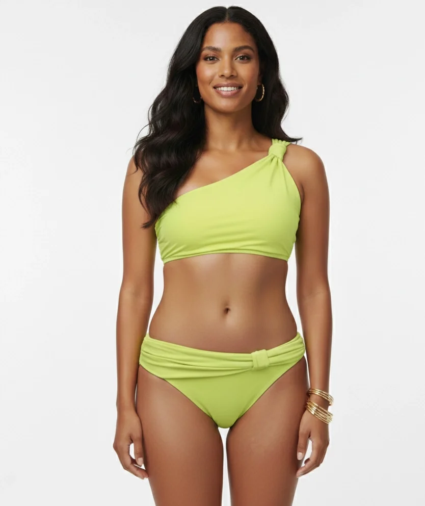 El bikini Lima Limón destaca por su diseño asimétrico, moderno y favorecedor. El top cuenta con un tirante regulable en el hombro que permite ajustarlo a medida, adaptándose perfectamente a cada silueta. Se anuda mediante una lazada que nace en el hombro y se prolonga hacia la espalda, proporcionando una sujeción óptima y realzando el pecho con comodidad.