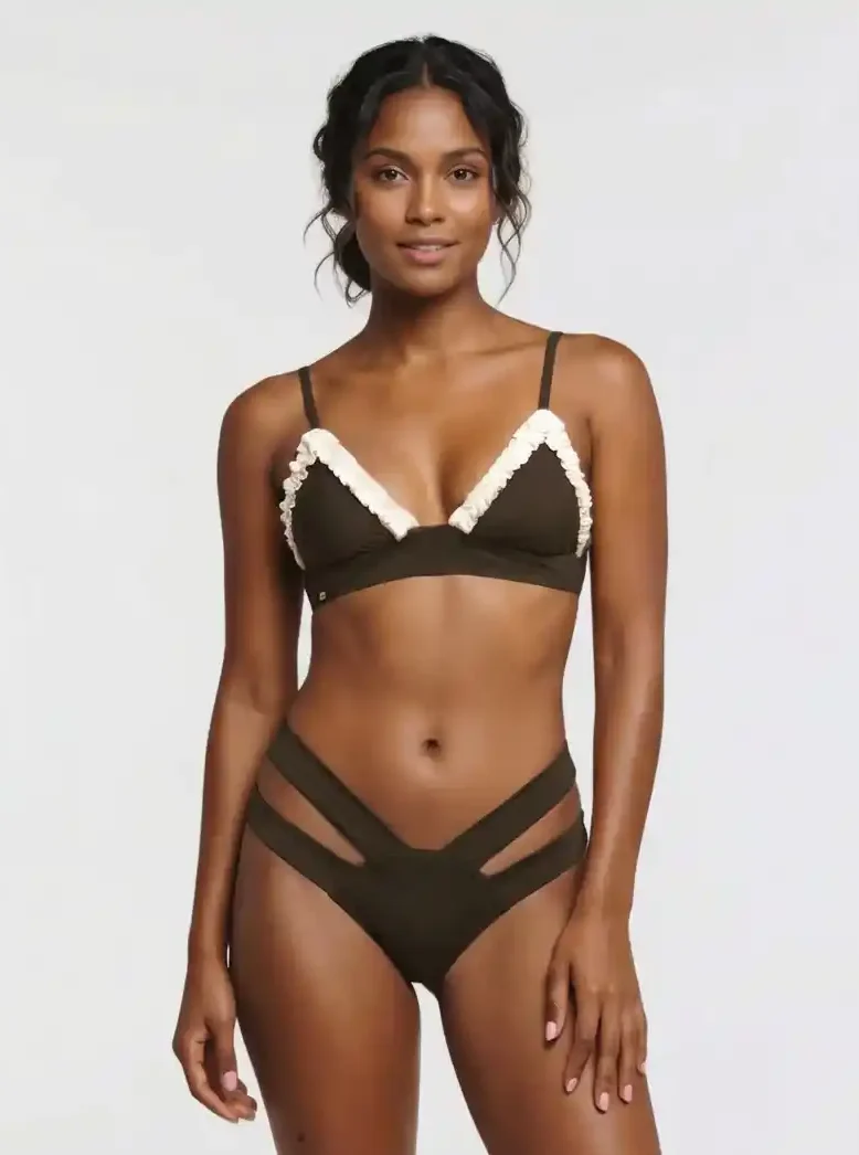 El triángulo se enmarca con un delicado efecto fruncido en todo su contorno, aportando movimiento y convirtiendo esta pieza en un diseño distintivo y especialmente favorecedor.