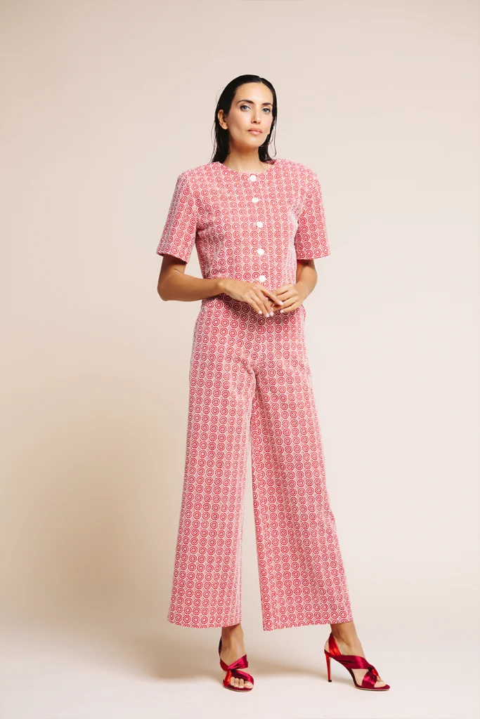 Está confeccionado en un tejido de batista bordada roja, éste genera una textura de relieve a la prenda, con un patrón estilo mandala floral perforado. Es un tejido ligero, transpirable y fresco, ideal para cualquier momento.