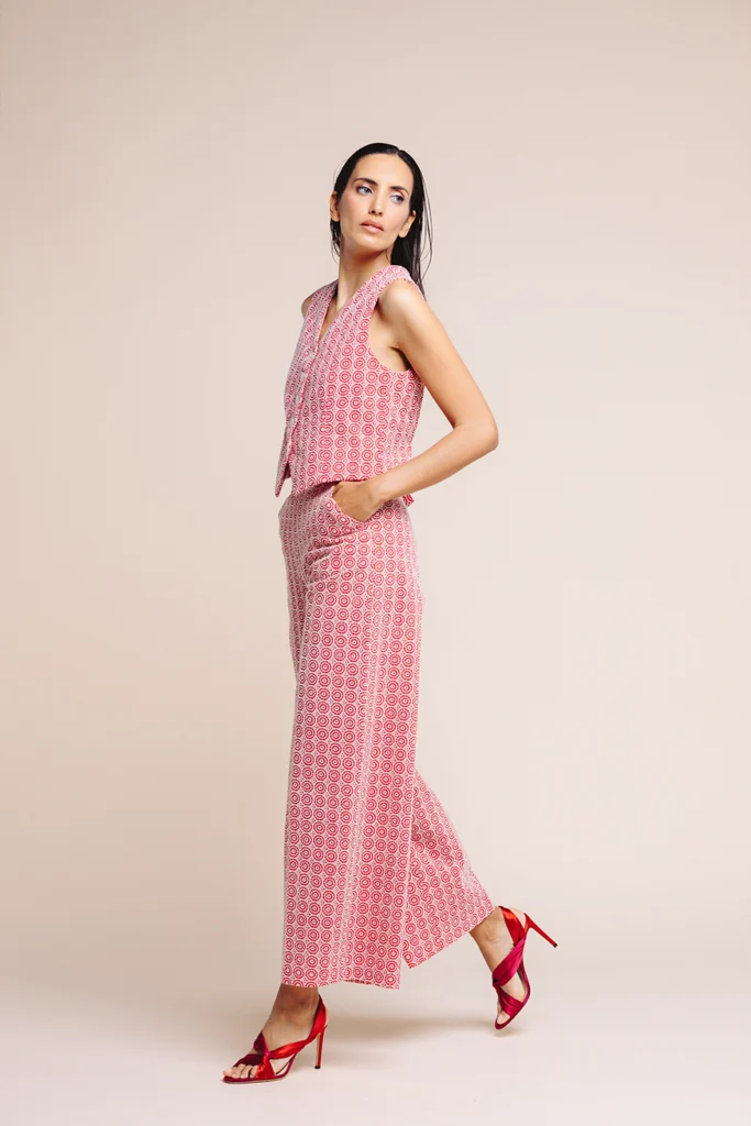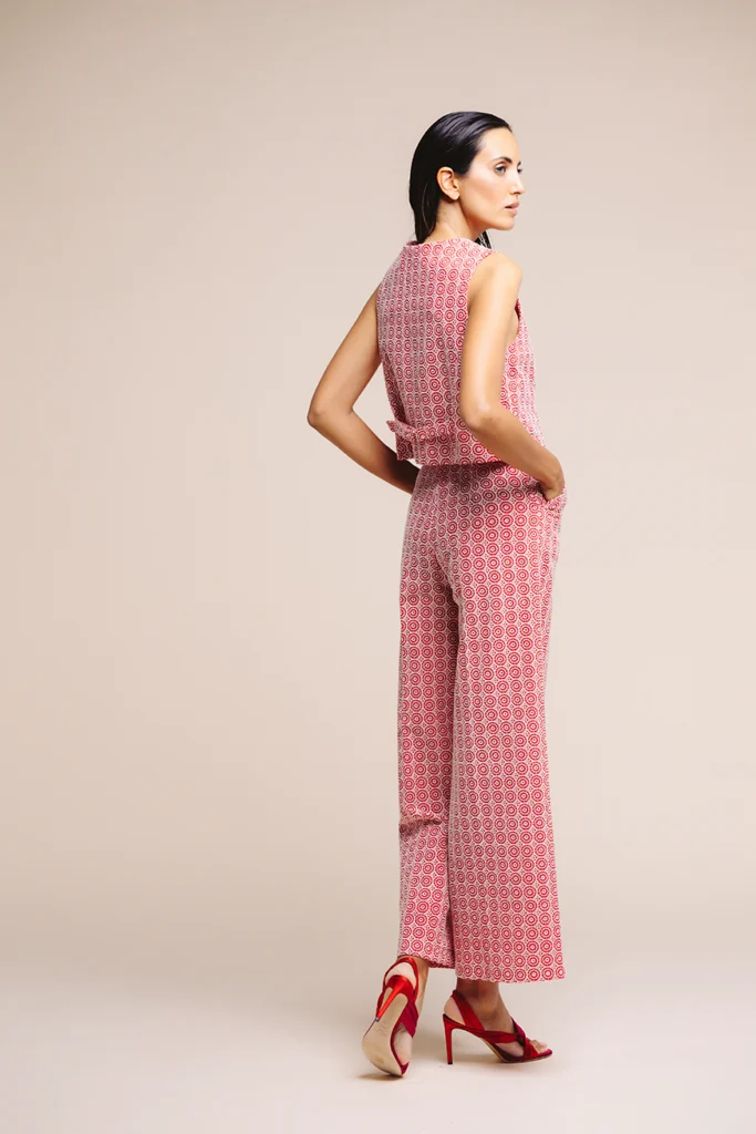 Está confeccionado en un tejido de batista bordada roja, éste genera una textura de relieve a la prenda, con un patrón estilo mandala floral perforado. Es un tejido ligero, transpirable y fresco, ideal para cualquier momento.