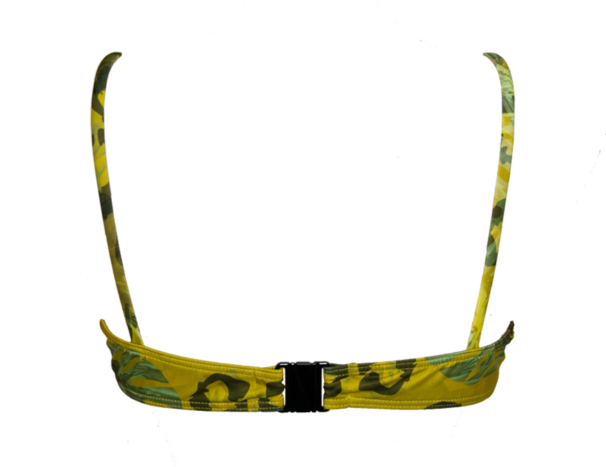 Este top de bikini con aro en tejido de licra estampado propio de la firma Elena Morales. Como método de cierre tiene una fornitura de plástico resistente al agua, antialérgico y realizado con micro plásticos reciclados.