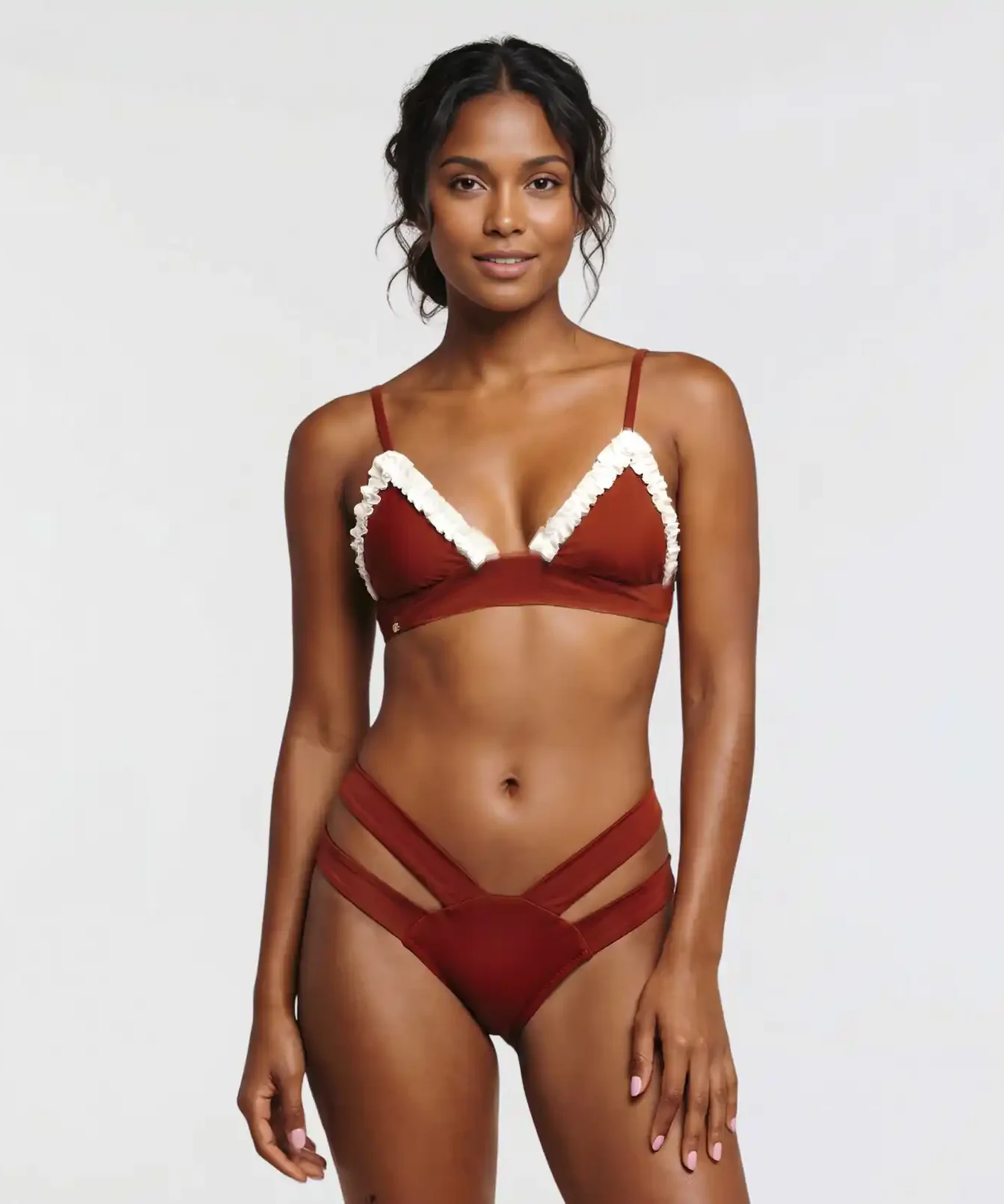 El triángulo se enmarca con un delicado efecto fruncido en todo su contorno, aportando movimiento y convirtiendo esta pieza en un diseño distintivo y especialmente favorecedor.